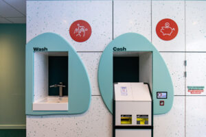 Foto boven: Handwasgelegenheid en mogelijkheid tot contante uitbetaling.